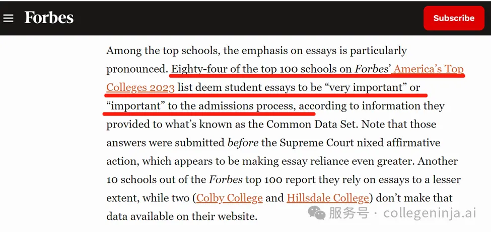 根据福布斯美国顶尖大学排行榜上的前100所学校提供的信息,有84所学校认为学生论文对于招生过程“非常重要”或“重要”。