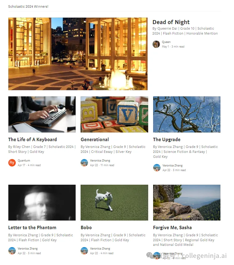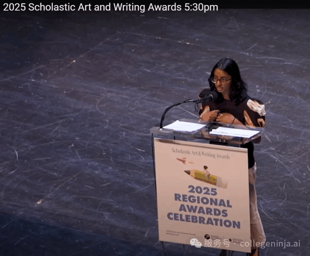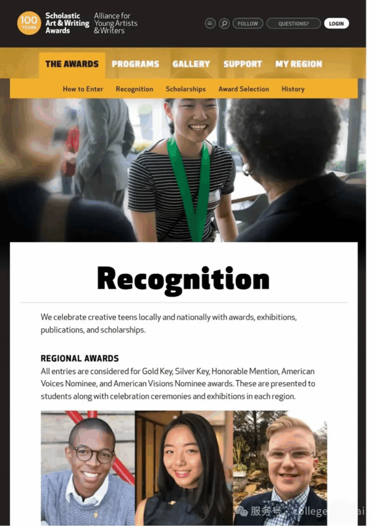 特别是全美Scholastic初高中艺术与写作大奖赛。这个比赛是美国规模最大、最负盛名的艺术和写作比赛,有100年历史,每年举办一届,肯定具有杰出艺术和写作才能的学生,并通过奖项向世界展示他们的杰出作品。
