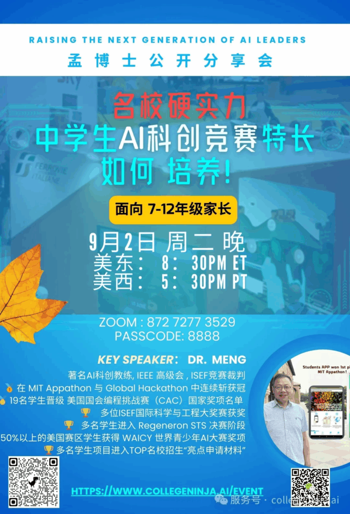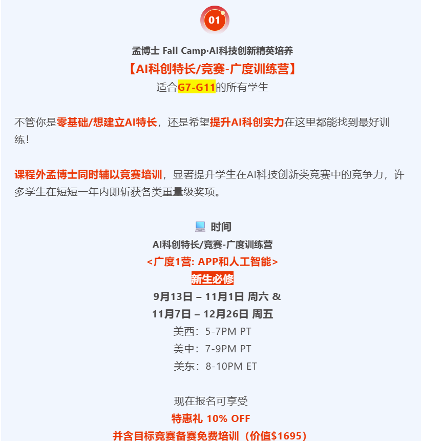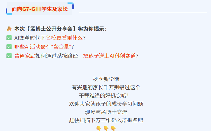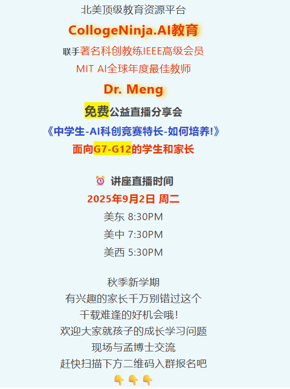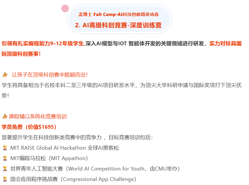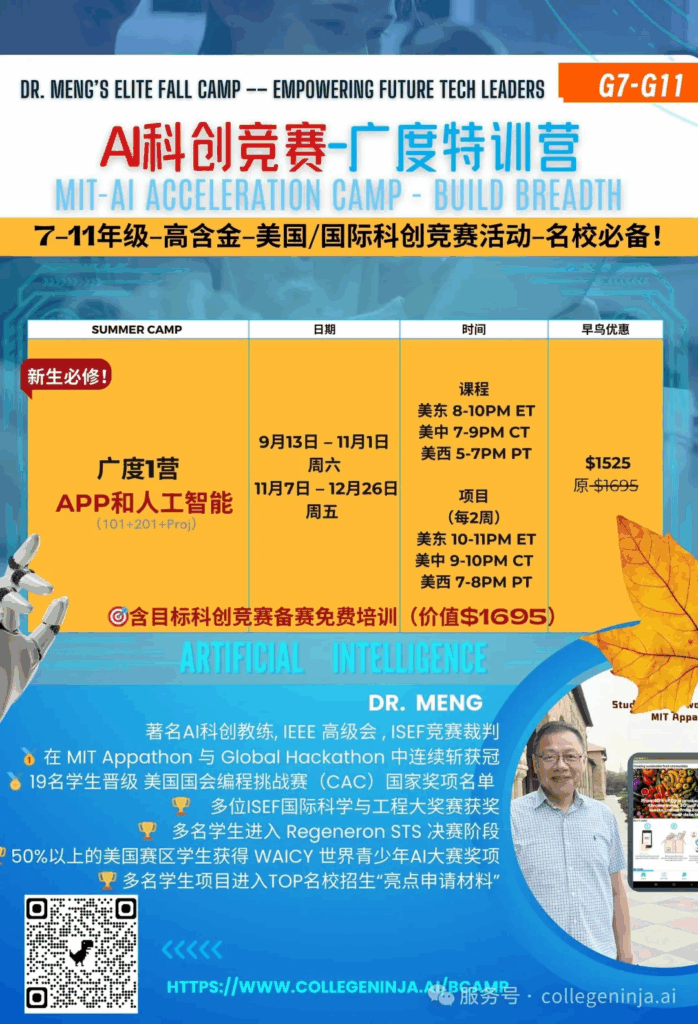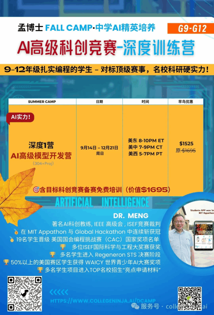 告诉大家一个好消息,今年孟老师AI科创秋季营招生啦,专为7–11年级学生打造的一站式AI科创竞赛精英训练计划,从0起步,系统培养孩子的AI创造力、跨学科思维与项目能力,直通美/国际高含金科创赛事,打造AI时代名校申请真正的硬实力!