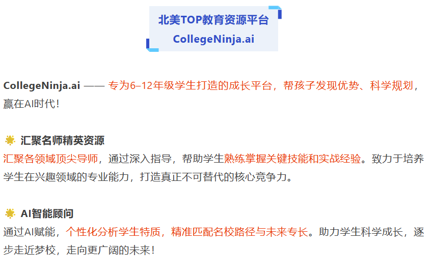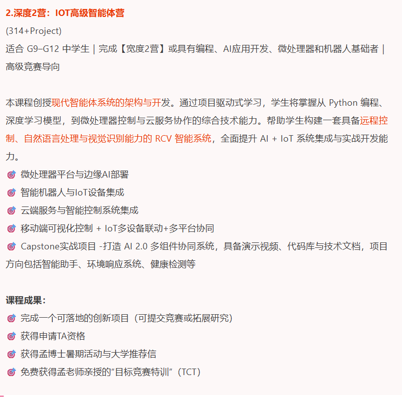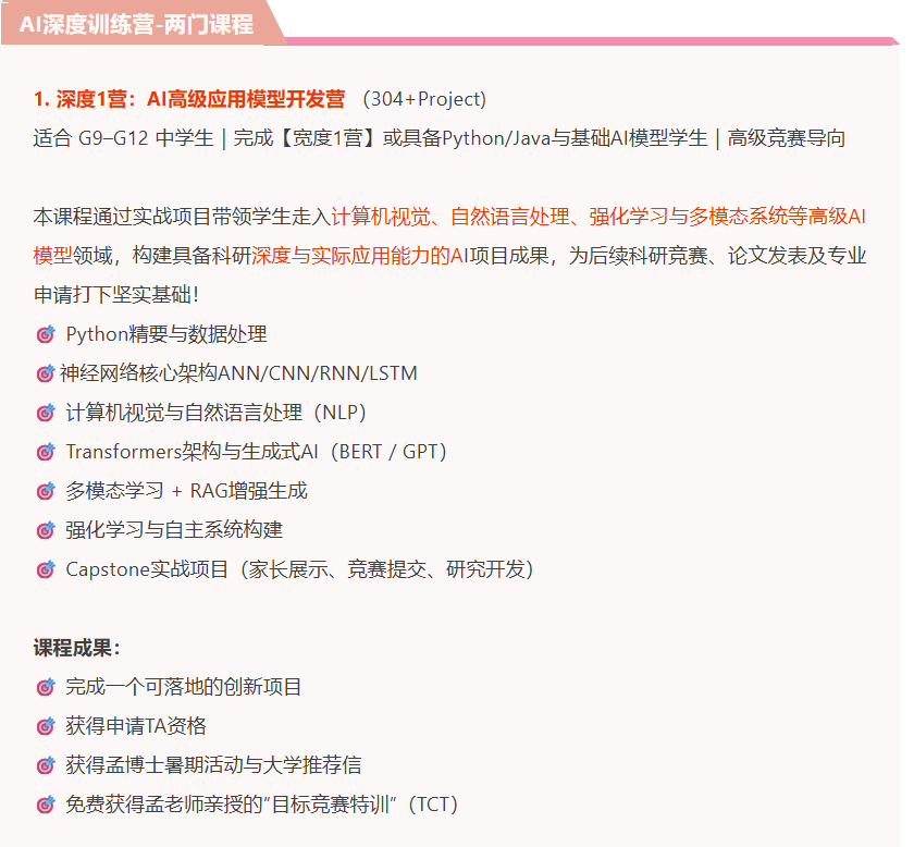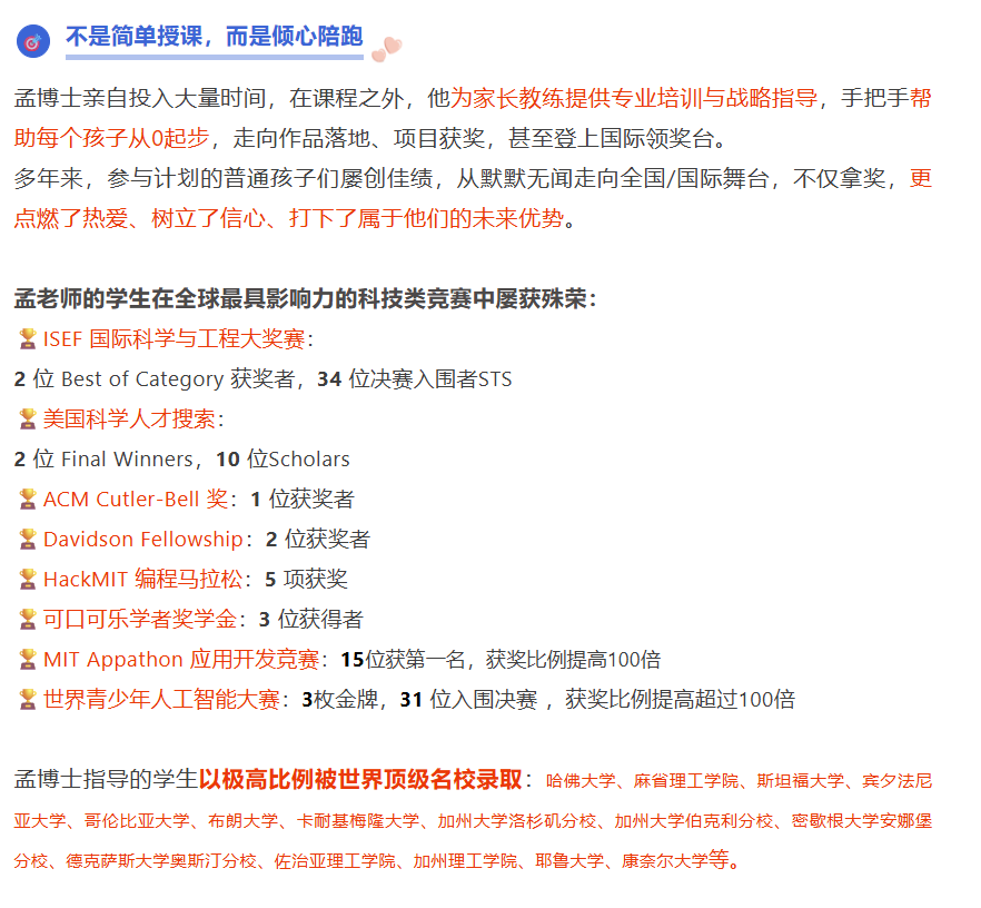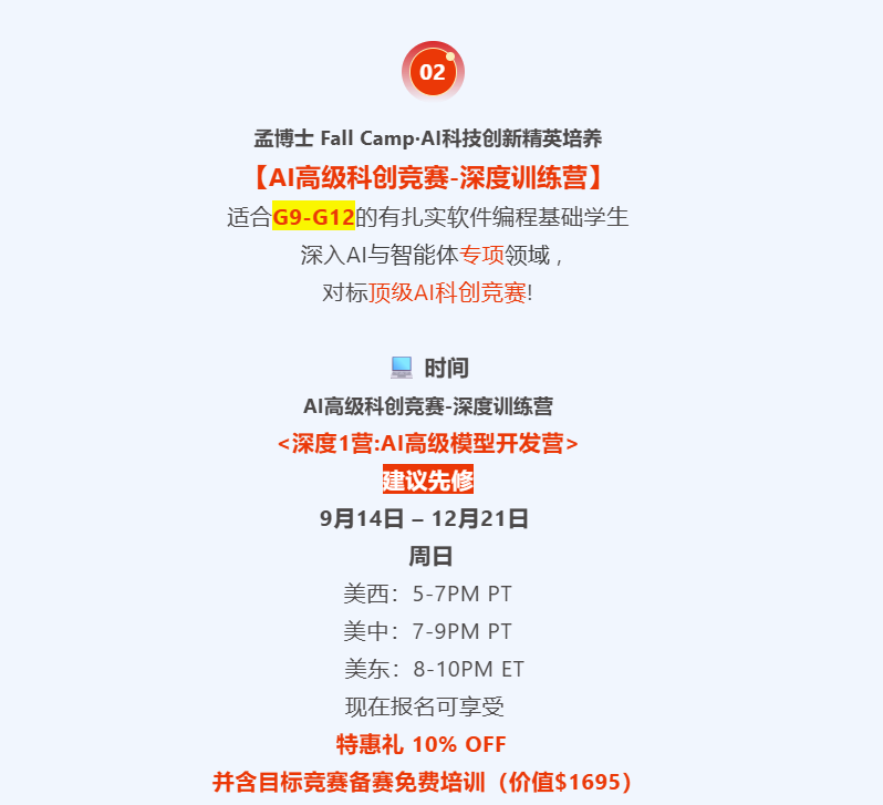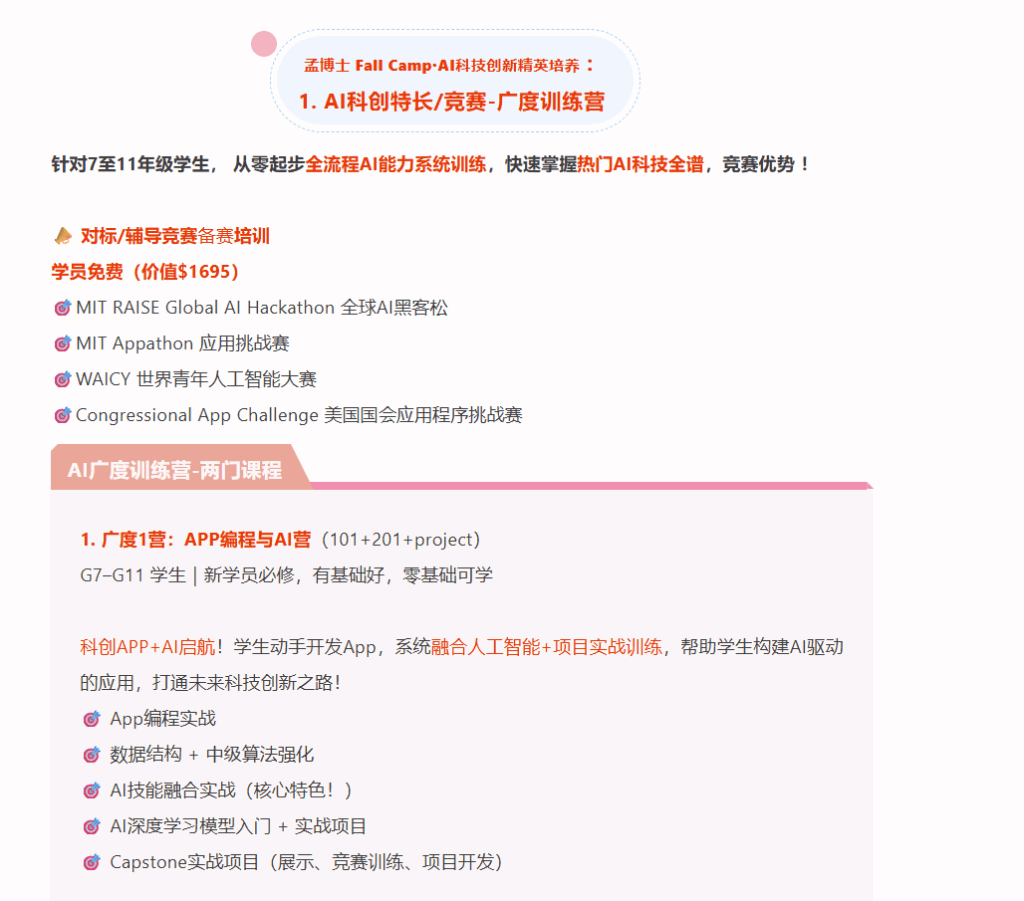 告诉大家一个好消息,今年孟老师AI科创秋季营招生啦,专为7–11年级学生打造的一站式AI科创竞赛精英训练计划,从0起步,系统培养孩子的AI创造力、跨学科思维与项目能力,直通美/国际高含金科创赛事,打造AI时代名校申请真正的硬实力!
