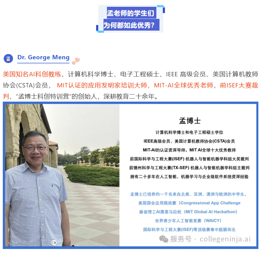 就有这么一位老师,打破了“前沿AI科创只属于天之骄子”的刻板印象,将一批又一批“普娃”送进了常春藤名校,他就是著名AI科创教练IEEE高级会员、MIT AI全球年度最佳教师, 前ISEF大赛裁判Dr. Meng。