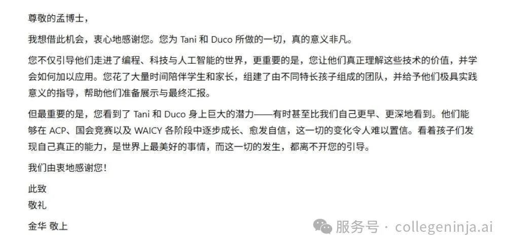👉 其中不乏来自普通家庭的学生,正是孟老师通过系统训练和真实项目,完成了从“零基础”到“AI科创舞台”的跨越。