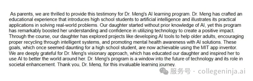 孟老师为学生们系统地打造极具竞争力的AI科创活动和竞赛,成为学生们脱颖而出的关键。这些项目不仅培养学生跨学科创新思维,更是他们申请世界顶尖高校的重要敲门砖。