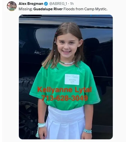 社群媒体上,家长张贴失联女童照片,请求民众协助寻人。(截自X平台Alex Bregman帐号)(若有侵犯著作者权益,请连络本社删除。)