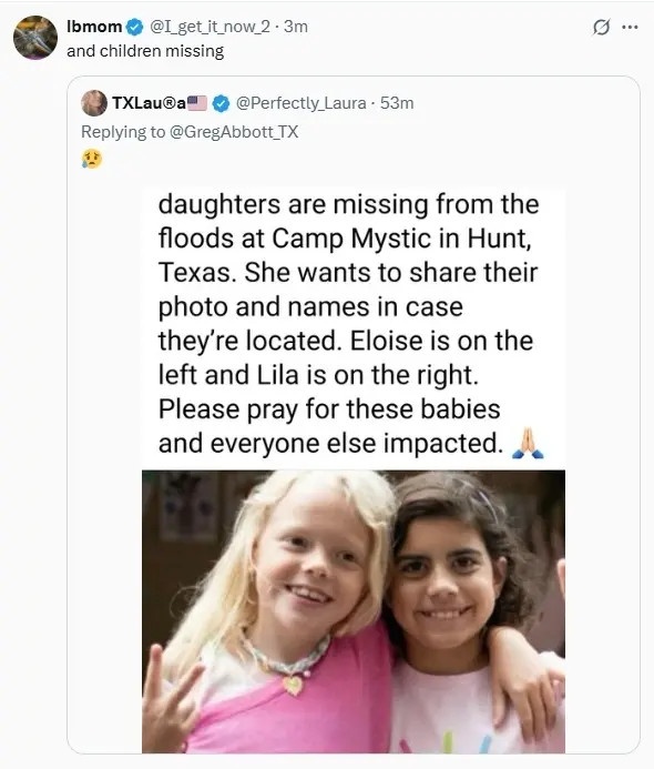 社群媒体上,不少家长张贴失联女童照片,恳请公众协助寻人。克尔维尔一名男子布莱恩·伊兹(Brian Eads)表示,凌晨3时30分左右,洪水冲毁了他们的拖车,他与妻子双双被水流冲走,自己靠抓住树木才幸运获救,但至今不知妻子下落。