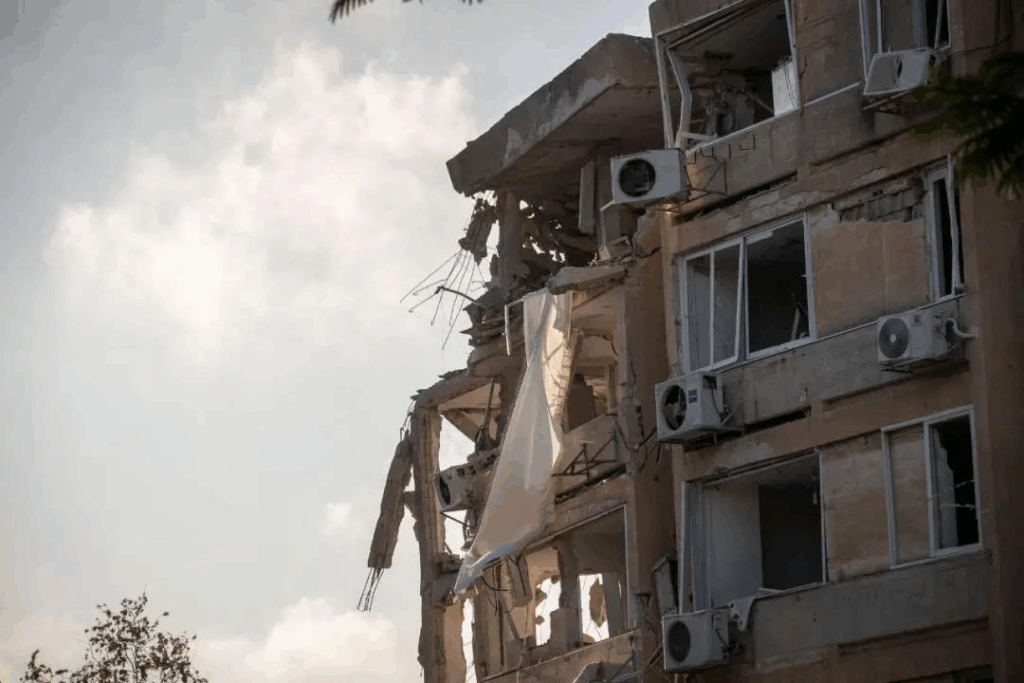 这是6月20日在以色列特拉维夫附近拍摄的一处在导弹袭击中受损的建筑。新华社记者陈君清摄