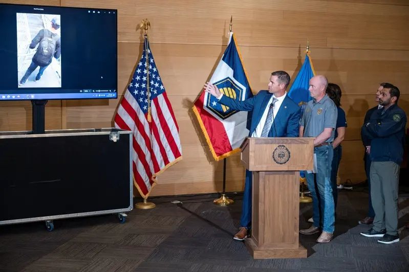 美国保守派活动家柯克10日在犹他谷大学遭枪击身亡后,犹他州公共安全部专员梅森在记者会会上,一边看嫌犯的影像,一边向记者发表讲话。(路透)