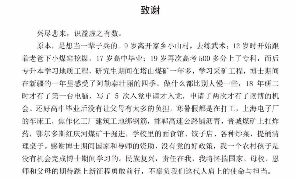 穷苦“挖煤小子”逆袭变博士!论文致谢词感动无数网友