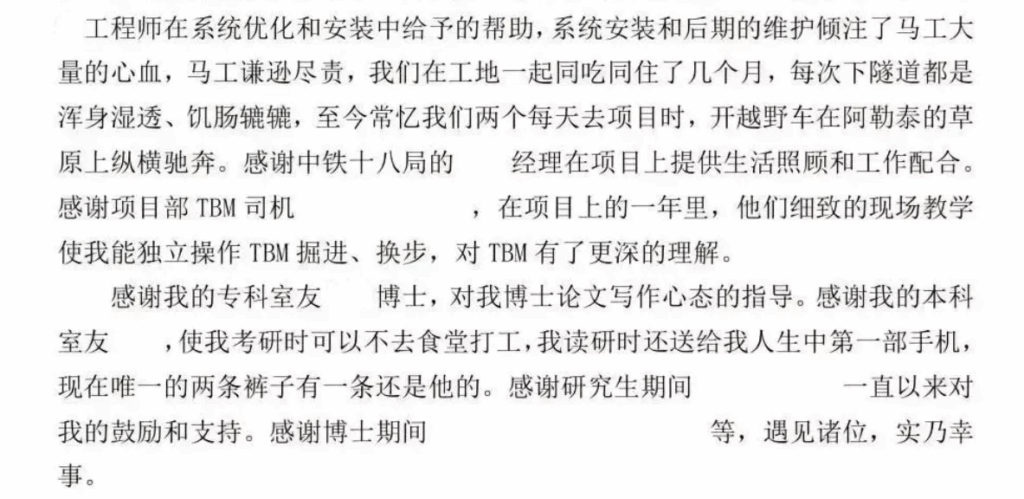 这篇致谢词中,没有华丽的辞藻,作者在每一段长长的感谢词中讲述了自己艰苦,却又无比充实的求学时光。在项目现场、在工地隧道、在每一个学习科研的关键节点,那个曾经的“挖煤小子”始终心怀感恩、坚持前行,手握星火,走出了大山,也走过了别人眼中的至暗时刻。