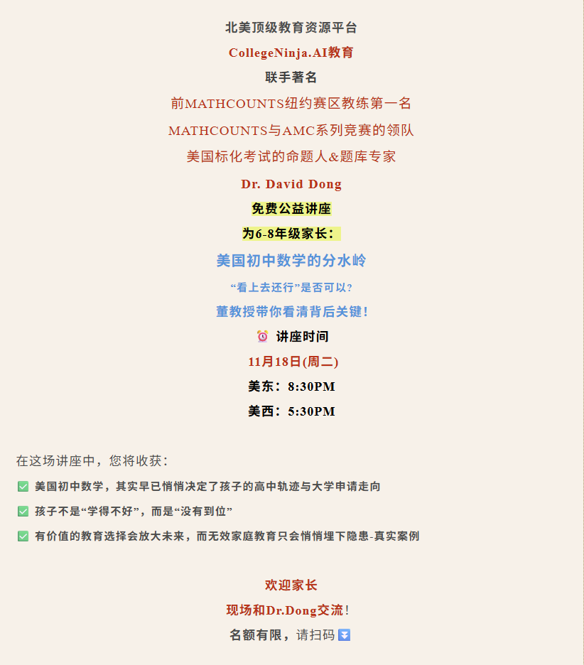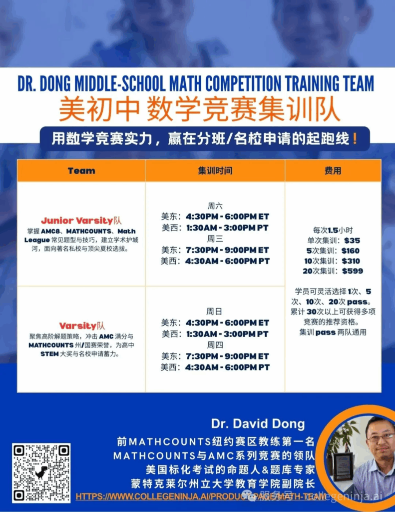 还要告诉大家一个好消息,Dr.Dong的2025初中数学竞赛集训队正在火热招生中~让学生用数学竞赛成绩,赢在分班与名校申请的起跑线!