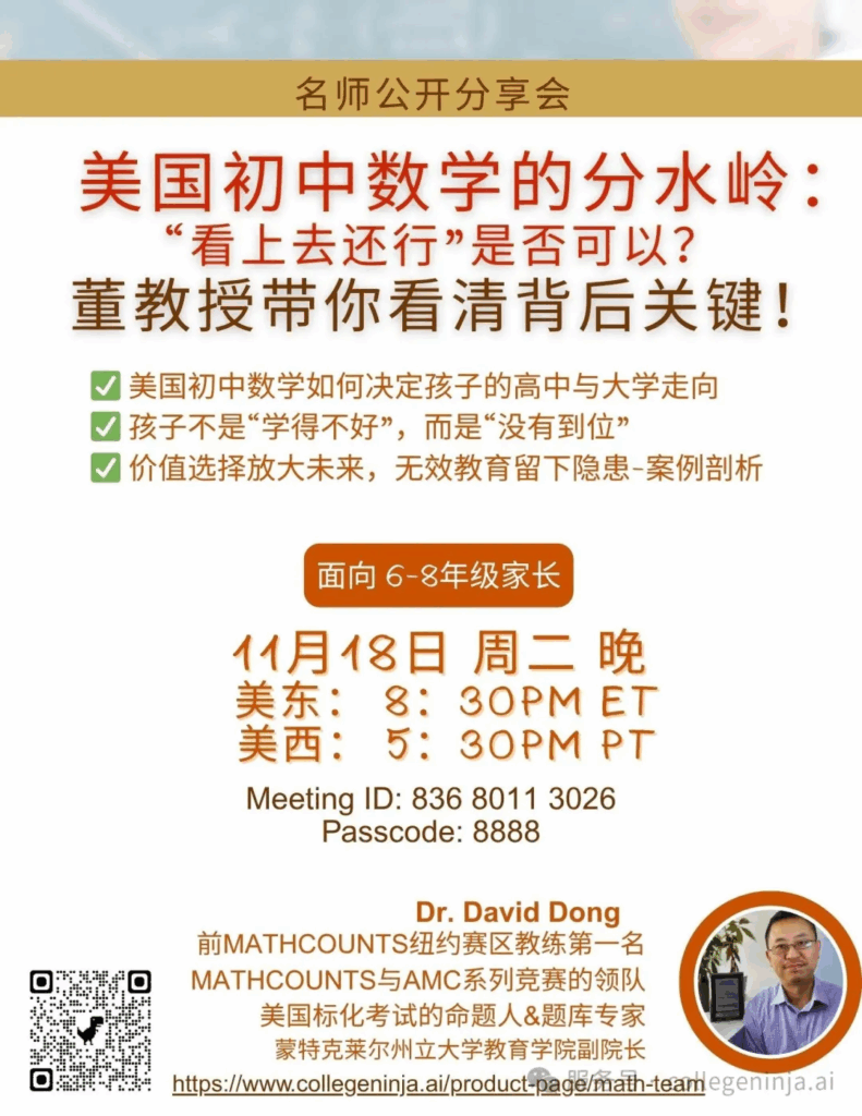 聚焦高阶解题策略,冲击AMC满分与MATHCOUNTS州赛/国赛荣誉,为高中STEM领域大奖和冲击名校蓄力。