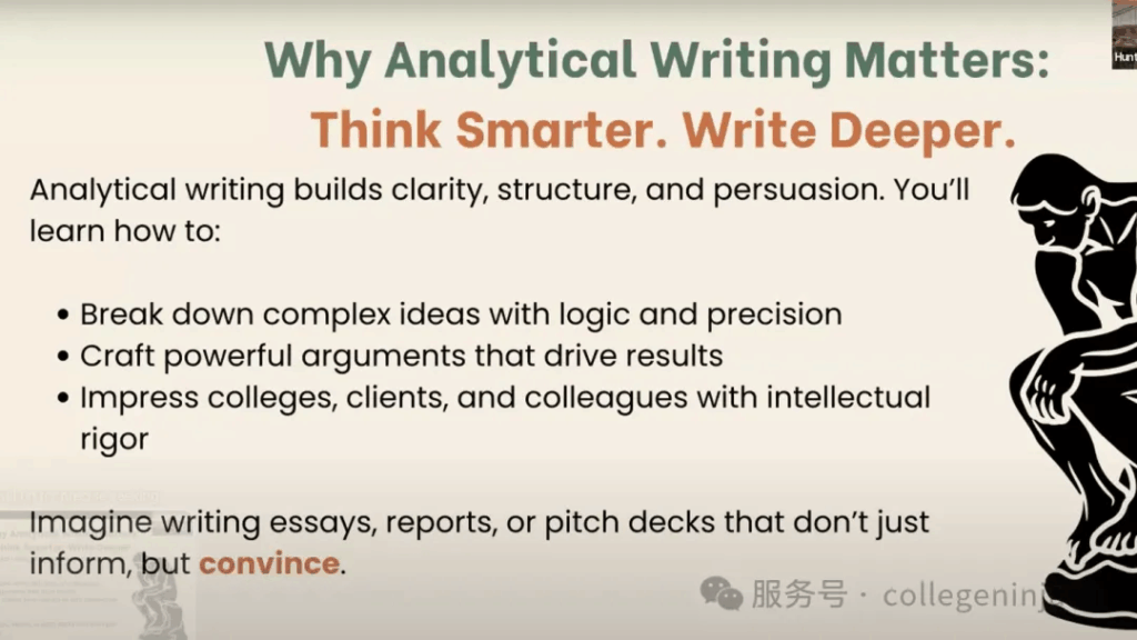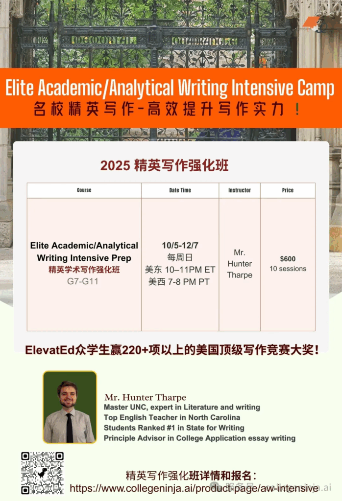 美国大学的申请文书,本质上就是一场“小型的写作竞赛”。能否通过短短几百字,让招生官信服你经历的价值,靠的正是分析性写作。