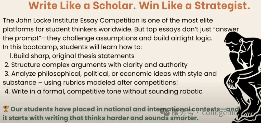 享誉全球的 John Locke 中学生论文大赛,由牛津、剑桥、哈佛、耶鲁等顶尖大学学者担任评审,评判标准正是批判性思维与分析性写作。获奖学生打动评委的,不是华丽的辞藻,而是清晰的逻辑与犀利的观点。也正因如此,这些学生往往成为名校招生官眼中的“重点关注对象”,在激烈的申请竞争中更容易脱颖而出。