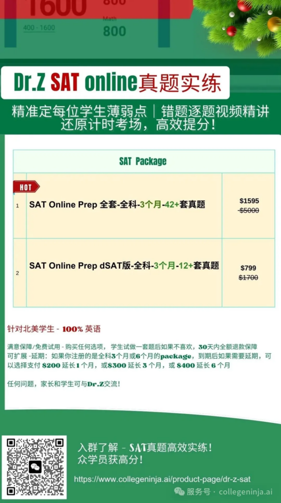 这正是由 Dr. Z 基于 10 年 SAT / ACT 教学与备考经验,结合 30+ 套高质量真题,所构建的 SAT / ACT 线上真题实练系统 , 让已经非常忙的孩子,高效冲刺备考,把有限的考试机会,用在最有把握的一次。