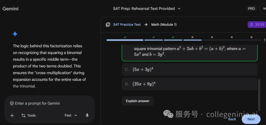 最近 SAT 圈子里有个大动作:Google 旗下的 AI —— Gemini 正式推出了免费的 SAT 全真模考功能。