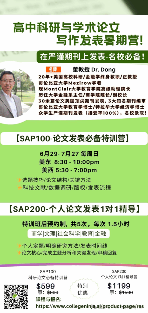 Dr. Dong指导许多高中生、本科生、硕士生、博士生在有效时间内,在严谨学术期刊中发表正规认可的论文。董老师的论文指导范围包括商科、金融,数理方法、社会科学、教育等,泛文/理各领域。