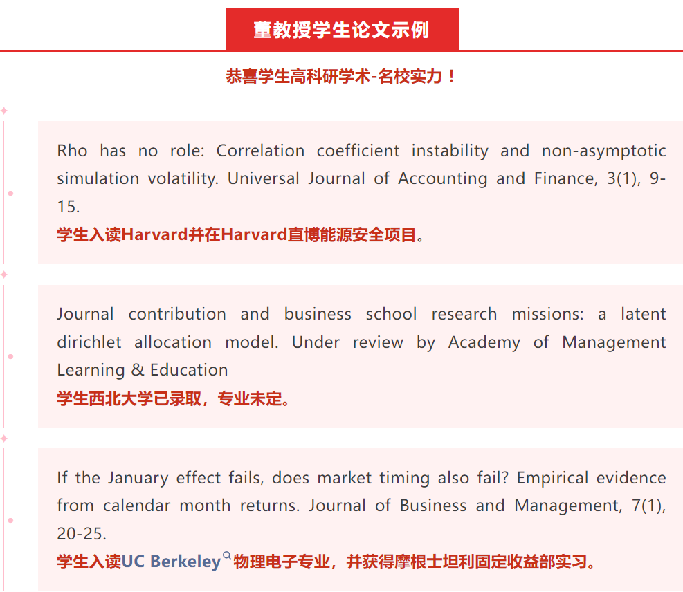 众学生经董老师指导发表论文的同学进入哈佛、UPenn、Columbia、西北大学、UC Berkely, Princeton等名校!