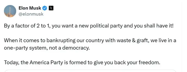 马斯克与川普龃龉以来,一直公开提出想组新政党的想法;他一直强烈反对川普的大又美政策包裹法案,而法案已在上周由国会过关。
