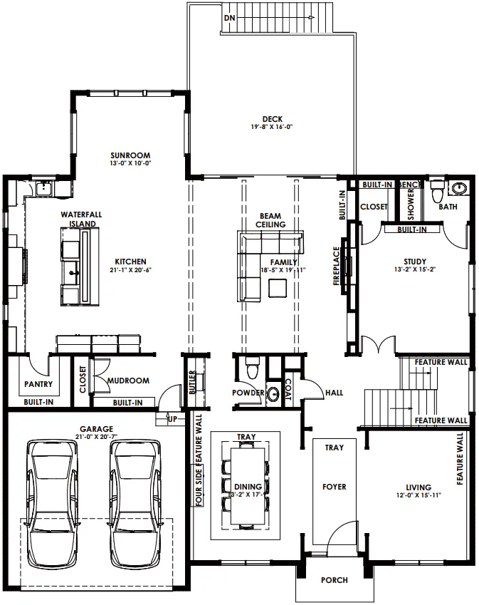 一层布局多个功能区 :家庭娱乐室、厨房、餐厅、客厅、书房、食品储藏间、沾泥物品寄存室及车库等。