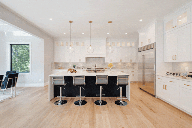 商用级顶级电器,配以堆叠式橱柜,橱柜内/橱柜下皆设置充足的照明,厨房正中安置宽敞的瀑布吧台和酒吧座位,可在开放式厨房中实现每个厨师的梦想。