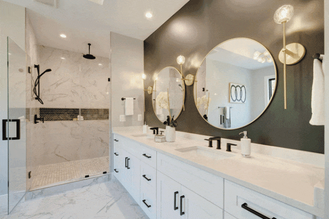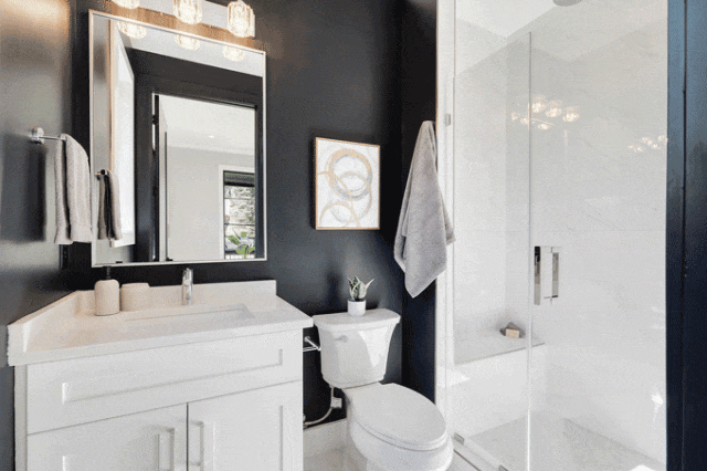 主卫设置深浸浴缸,双人洗手盆和玻璃淋浴区,满足了基本功能需求;规则式吊顶使得整个空间层次更加丰富。