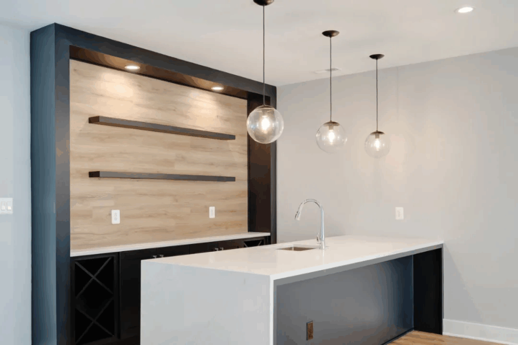娱乐室一角设置开放式吧台,作为一处休憩节点,方便使用,也不会影响娱乐室整体空间的通畅。