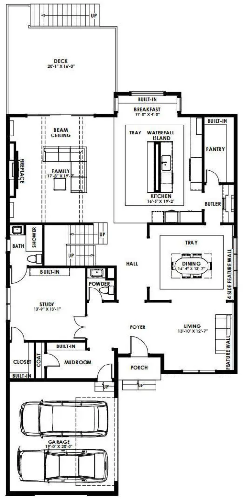 一层布局多个功能区 :家庭娱乐室、厨房、餐厅、客厅、书房、食品储藏间、沾泥物品寄存室及车库等。