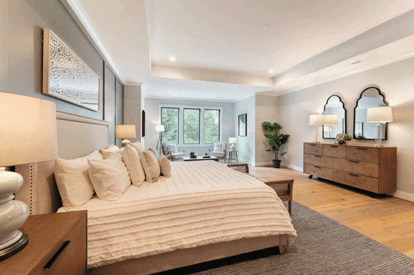 舒适宽敞、功能复合的主卧套房,三连窗让空间视野更加通透,精心设计的背景墙使房间多了一分时尚感。附带的休闲区域,使得整个主卧套间更有格调。