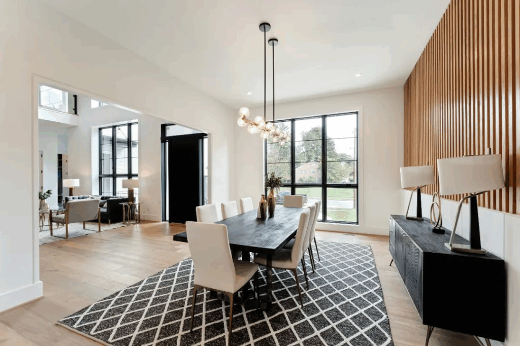 进入大门,充满自然采光的开敞式门厅和起居区随即呈现。餐厅装潢令人惊叹,将优雅与精致完美融合。
