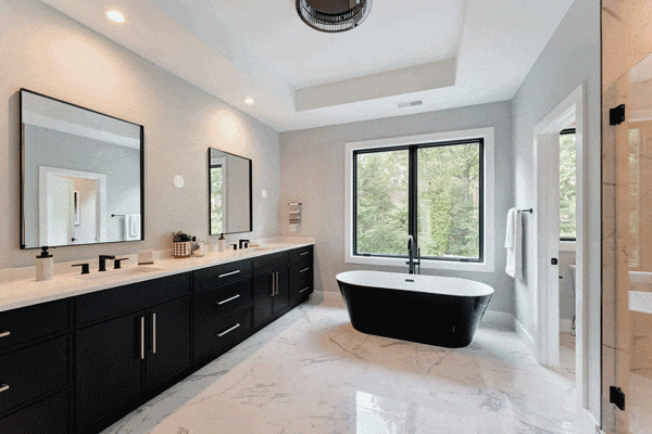 主卫设置深浸浴缸,双人洗手盆和玻璃淋浴区,满足了基本功能需求;规则式吊顶使得整个空间层次更加丰富。
