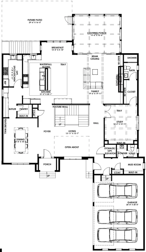 一层布局多个功能区 :家庭娱乐室、厨房、餐厅、客厅、书房、食品储藏间、沾泥物品寄存室及车库等。